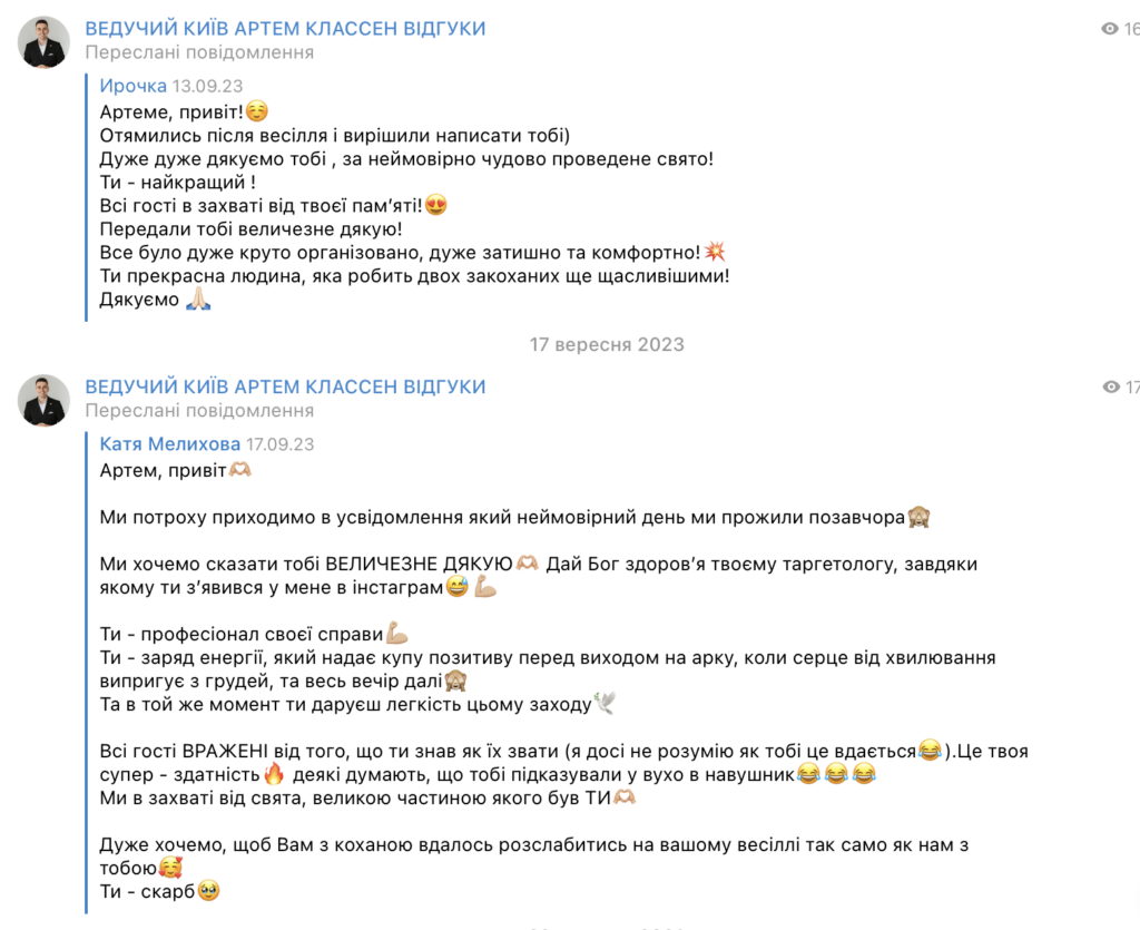 У якийсь момент я задумався про це і вирішив, що мої майбутні замовники матимуть доступ до РЕАЛЬНИХ відгуків, тож знайшов креативне рішення. Створив телеграм-канал, куди пересилаю повідомлення, тож ви можете звʼязатися безпосередньо з будь-яким автором відгуку, поставивши уточнювальні запитання.